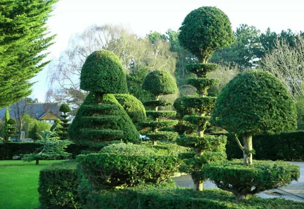 Часто присутствуют топиарные фигуры. Топиары стригут минимум 2 раза в год придавая самые разные формы (кубы, конусы, пирамиды, шары, спирали, фигуры животных).
