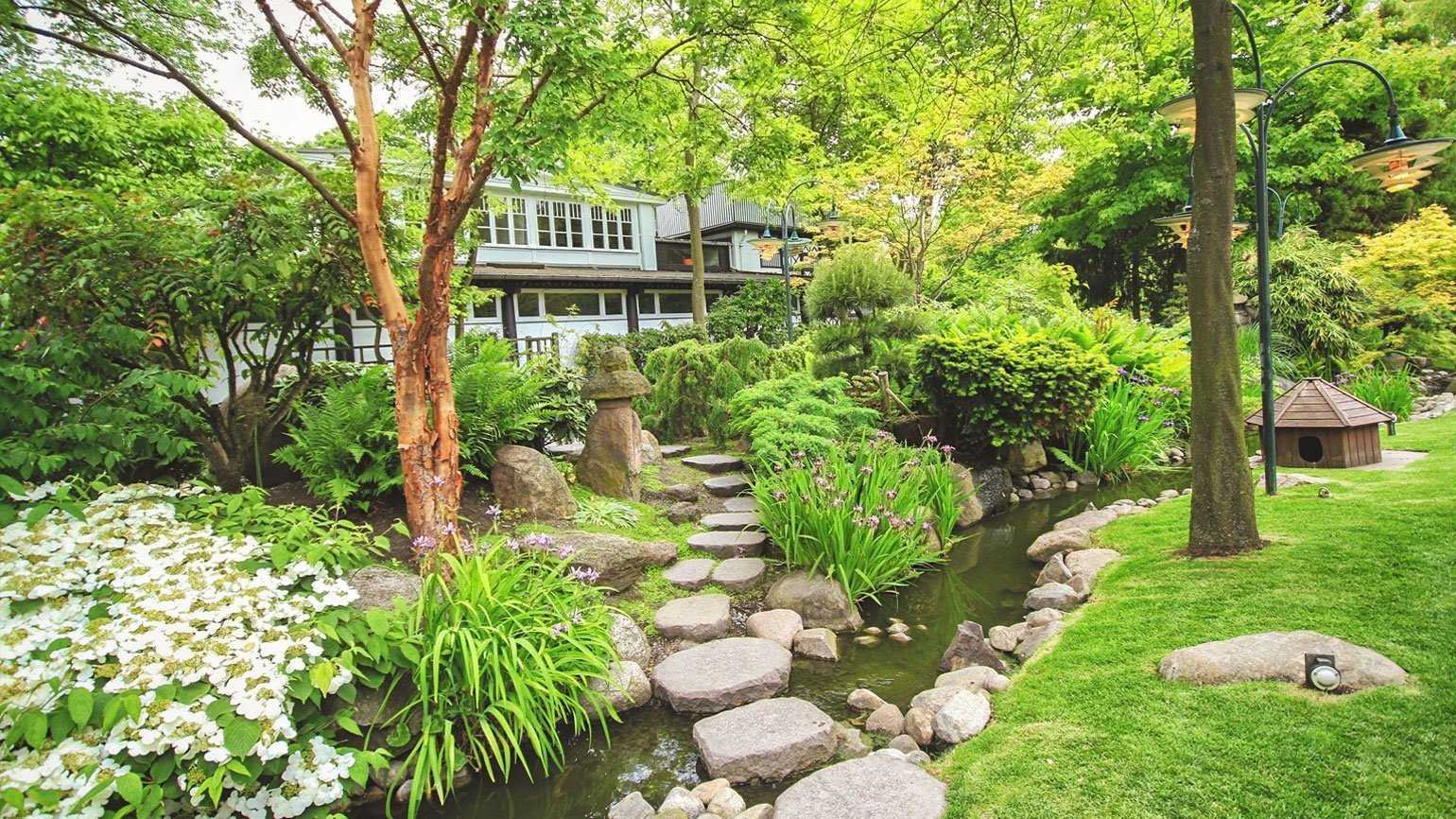 Ключевые элементы. Ландшафт должен органично сочетать природные локации и архитектурные строения. В последних могут присутствовать классические элементы китайской архитектуры ― покатые крыши, фигурки драконов в декоре. В таких проектах много объектов из камня ― дорожки, извилистые галечные тропинки, обрамлённые камнями водоёмы, мостики.