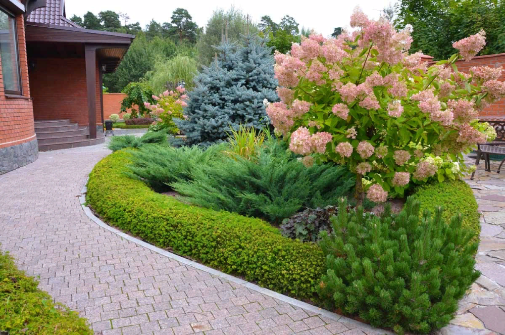 Для климата средней полосы подходит сосна горная и массивы низких кустарников — спирея японская, спирея березолистная. Их достаточно обрезать несколько раз за сезон, поливать когда долго нет дождей и периодически удобрять. Сложного ухода они не требуют.