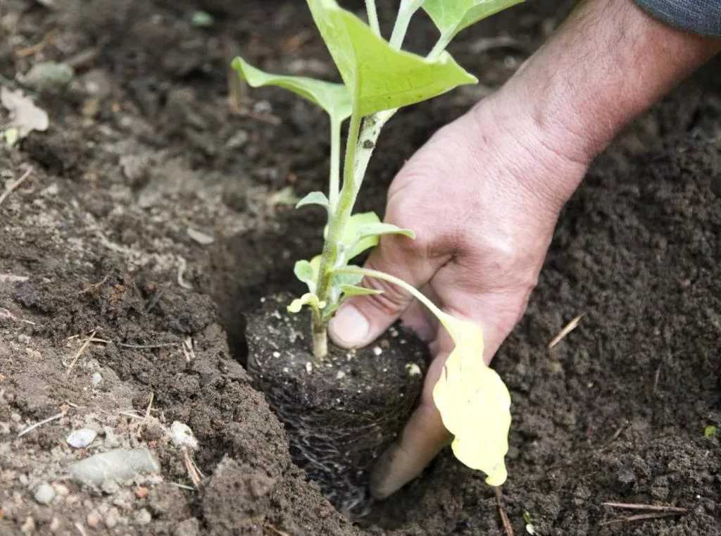 Важно! Расстояние между соседними баклажанами Рома при пересадке должно составлять не менее 0,5 м, а ширина междурядий – около 0,7 м. Пересаживают растения вместе с комом земли путем перевалки