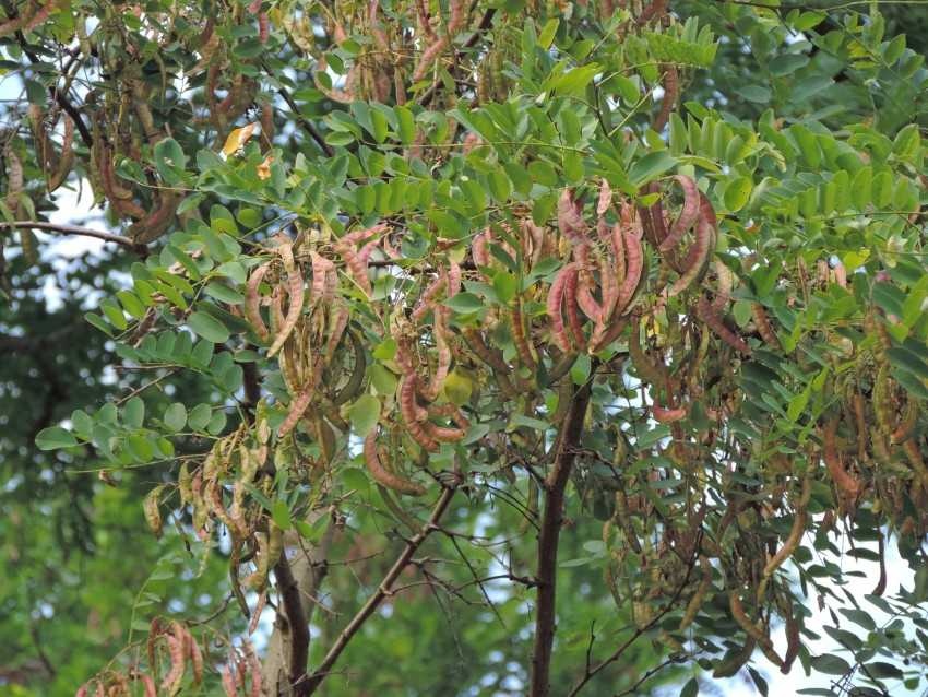 Листья непарноперистые, расположены поочередно. На длинном черешке около 20 листиков-эллипсов. Летняя окраска желто-зеленая, а осенняя – темно-зеленая. У основания веток формируются прилистники в виде острых, длинных шипов.