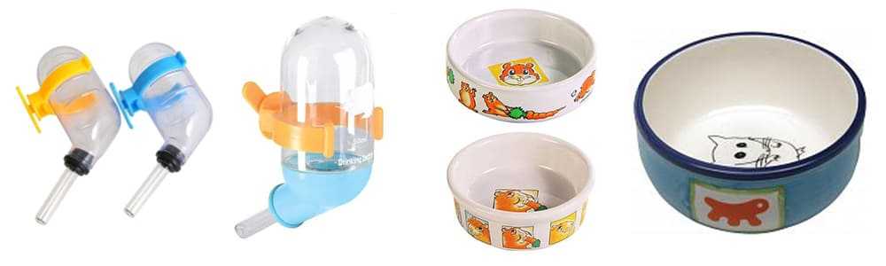 Для сухой пищи можно сделать подвесную миску, которая крепится к прутьям. Для жидкостей нужна тяжелая миска, чтобы грызун не смог ее сдвинуть. Она может быть сделана из керамики или фарфора. Удобно пользоваться ниппельной поилкой. Она крепится с внешней стороны прутьев и выглядит как бутылочка с металлическим шариком на конце. Поилку нужно установить так, чтобы легко было дотянуться до нее.