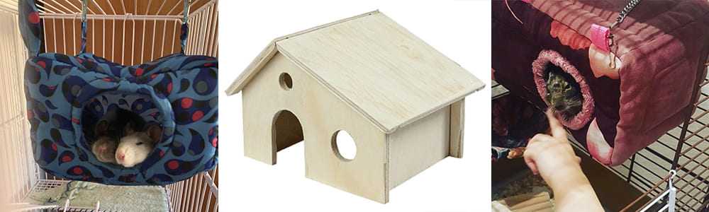 Для отдыха питомцу необходим пластиковый или деревянный домик внутри клетки. Его можно установить на пол, на полку или на некоторой высоте прикрепить к прутьям. Внутри домик можно застелить мягкой тканью.
