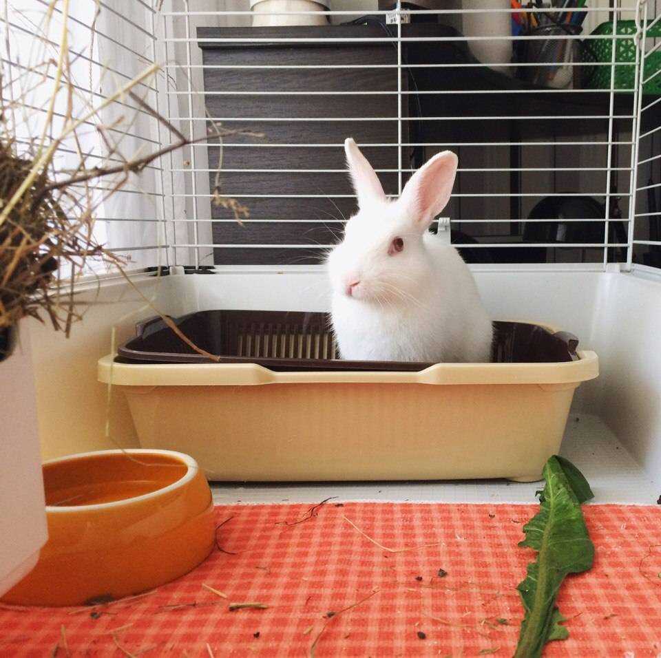 - Лоток – один или несколько. Один лоток устанавливают внутри клетки, другие – в квартире. Туалет должен иметь высокие бортики с трёх сторон, чтобы наполнитель не высыпался из него на пол. Выбирайте лоток просторный, чтобы кролику было удобно пользоваться им.