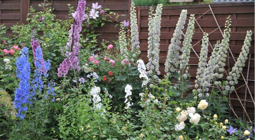 - Выбор места и освещение. Дельфиниум многолетний предпочитает расти на открытых участках в легкой полутени, так как яркий цвет вызывает выгорание лепестков. Оптимальный вариант — посадка в центре цветника или расположение у стены дома, забора, где есть защита от палящих лучей солнца. Место не должно продуваться ветром — сильные порывы могут легко сломать полые стебли у самого основания. Поэтому рекомендуется высаживать кусты рядом с кустарниками, деревьями, живой изгородью.