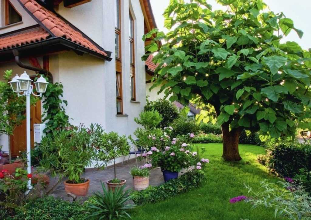 В грамотно созданном ландшафтном дизайне деревья соответствуют размерам участка . Не стоит покупать саженец дуба и сажать его в небольшом по площади саду. Когда он вырастит, превратиться в гиганта, способного закрыть своей кроной все свободное пространство. Его корни разрастутся и заберут из почвы все питательные соки. Это отрицательно скажется на любых других посадках.