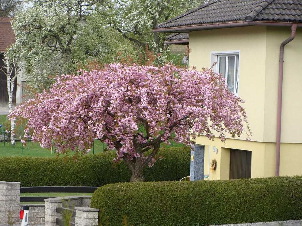 Сорт японской вишни (сакуры), обладающий поникающими дуговидными побегами. Зацветает в конце марта, формируя пышные пучки крупных махровых цветков розового окраса. Плоды съедобные, морозостойкость высокая.