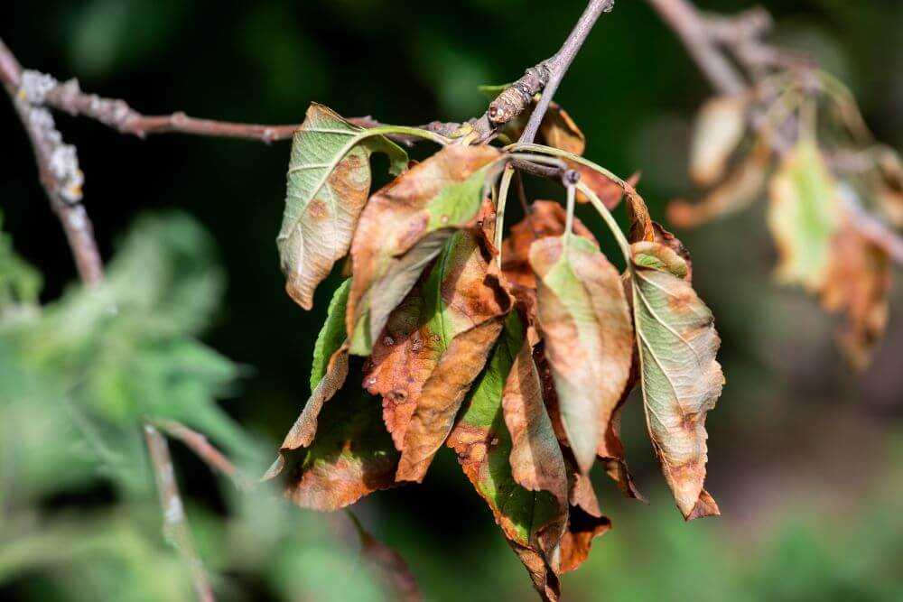 Монилиальный ожог. Первые признаки монилиального ожога становятся заметны весной. В мае на яблоне можно увидеть листья, которые выделяются красным оттенком в центральной части. Со временем листовые пластины скручиваются и усыхают, а цветки приобретают коричневый цвет и осыпаются.