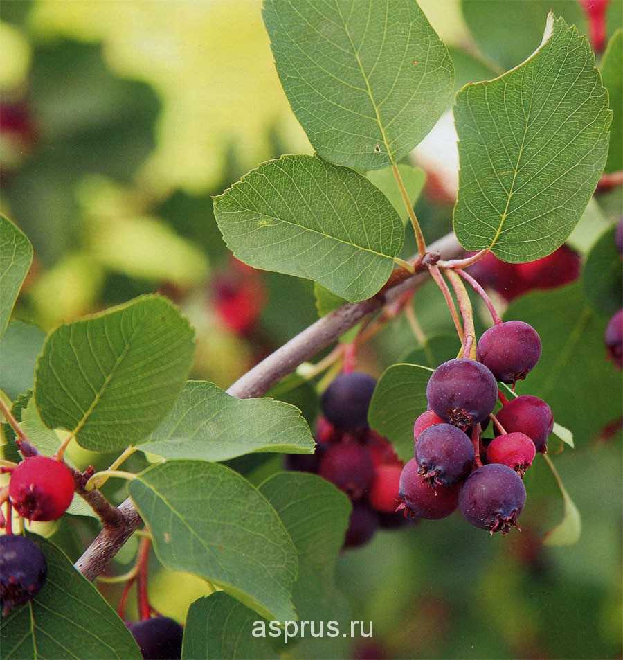 A.аlnifоliа – листопадное кустарниковое растение или небольшое деревце с яйцевидными или практически округлыми листьями, расположенными на черешках средней длины. Цветки белого окрашивания, диаметром до 30 мм, собранные в кистевидные соцветия. После отцветания образуются съедобные небольшие фиолетовые плоды с хорошими вкусовыми характеристиками и товарным внешним видом.