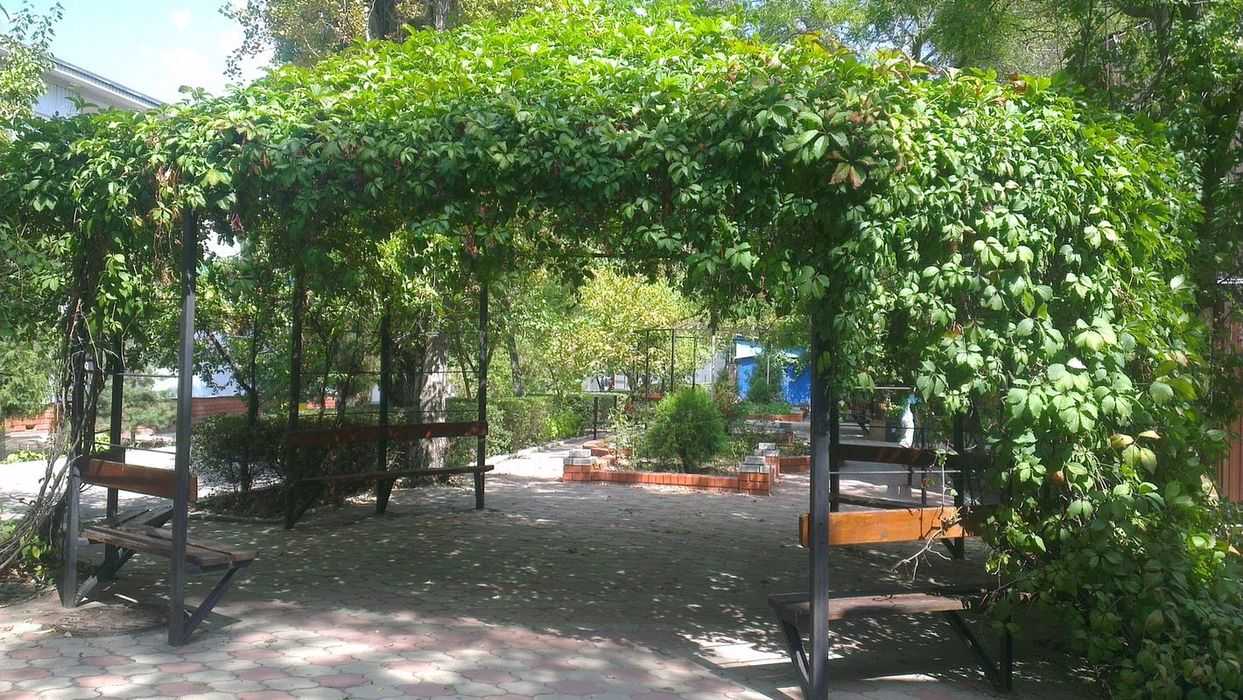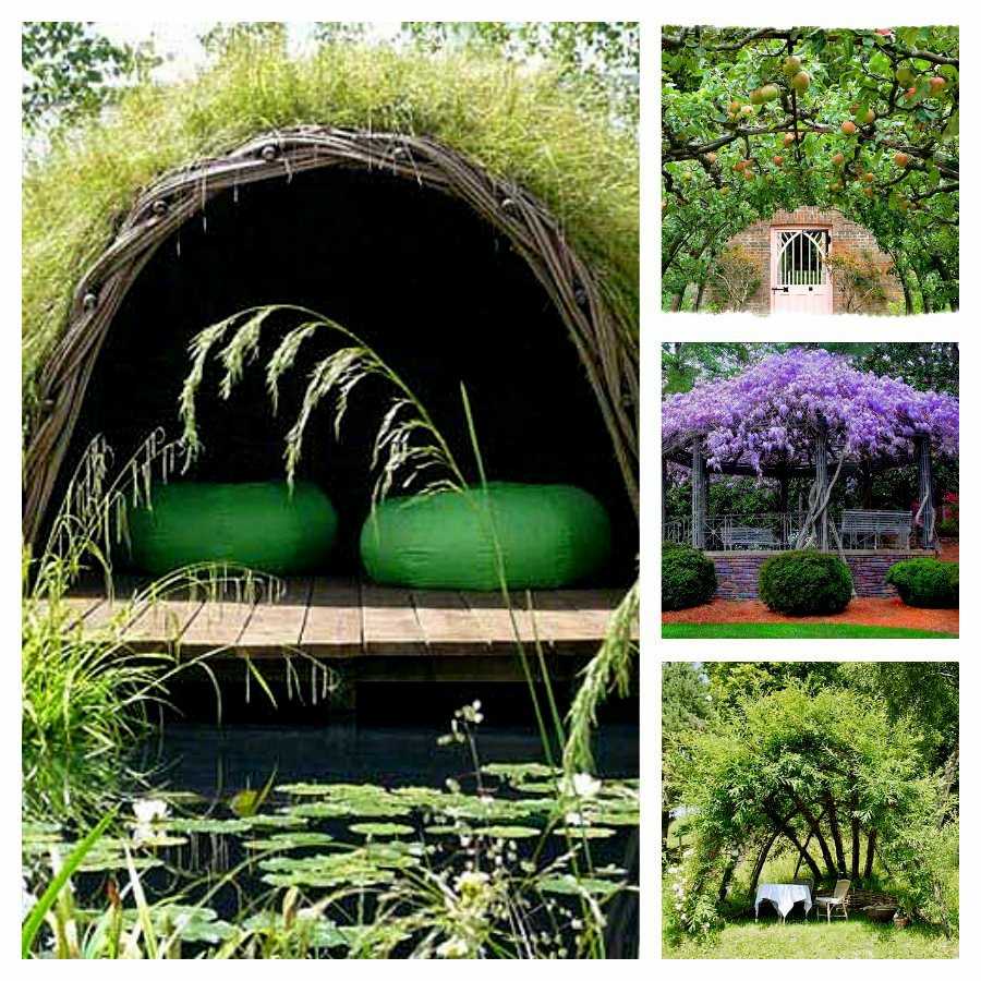 - Беседки, сформированные из деревьев и кустарников, в данном случае используются быстрорастущие культуры: шелковица, тополь, ива, рябина, кудрявый клен, канадская ирга с обильной кроной и пр.