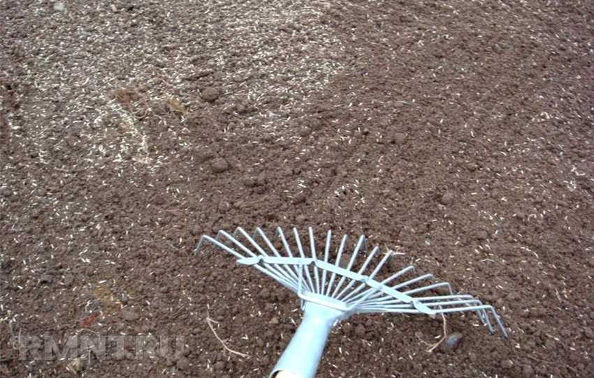 - Непосредственно перед посадкой ровняем граблями – это нужно сделать только в сухую погоду.