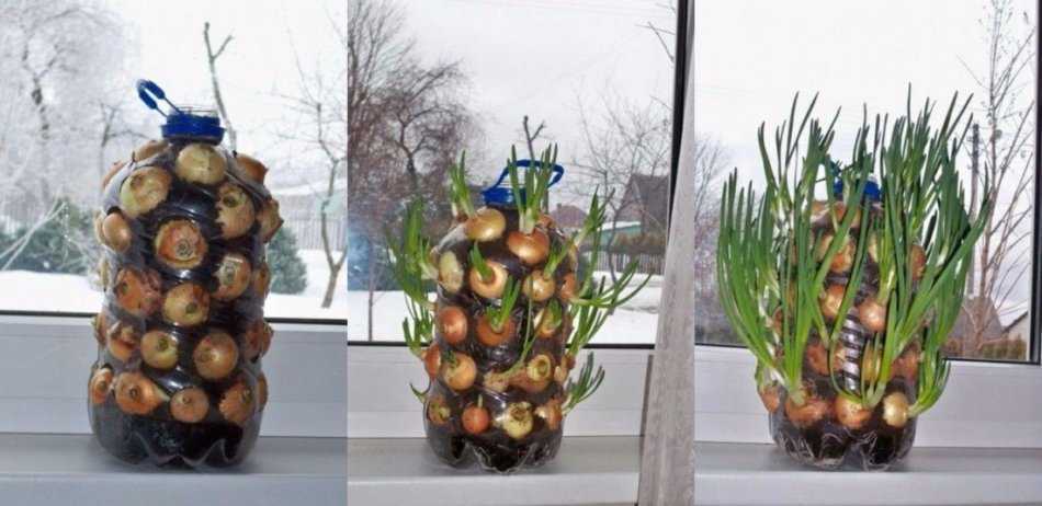 Лучше всего выращивать лучок из крупных луковиц. Для этого можно смастерить мини-грядку. Она изготавливается из 5-литровой пластиковой бутылки.