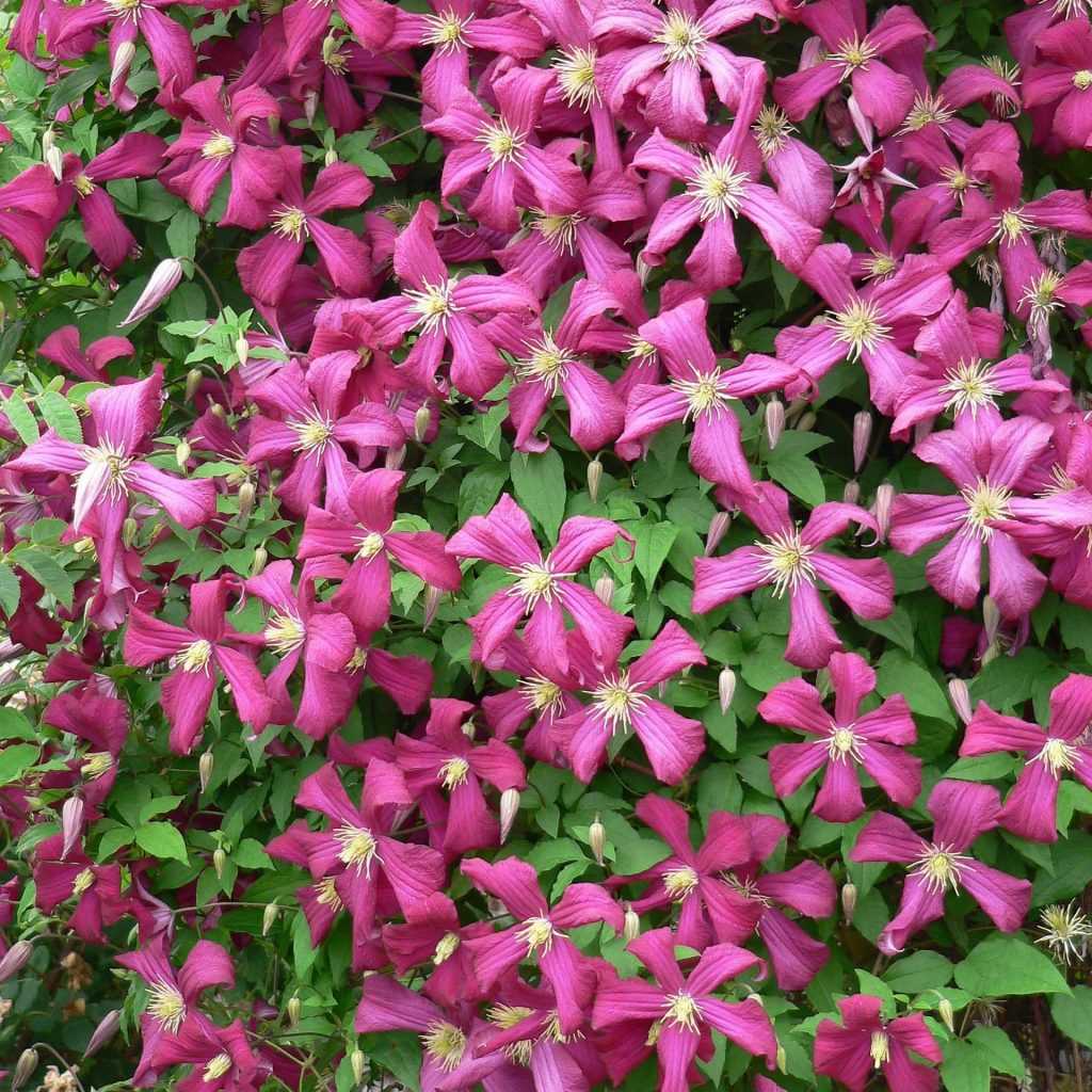 Поздноцветущий клематис из группы Жакмана. Четырехметровый «верхолаз»! Ярко-фиолетовые с пурпурным отливом бархатные цветочки среднего размера (8-10 сантиметров в поперечнике).