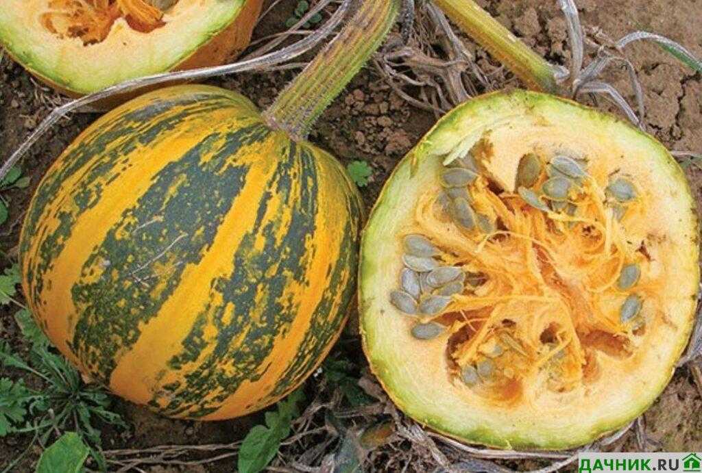 Голосемянная тыквина имеет округлую форму, и желто-зеленый полосатый окрас, весом 3-7 кг. Внутри мякоть оранжевого оттенка, традиционного вкуса. Чаще всего сорт выращивается для получения качественных семян.