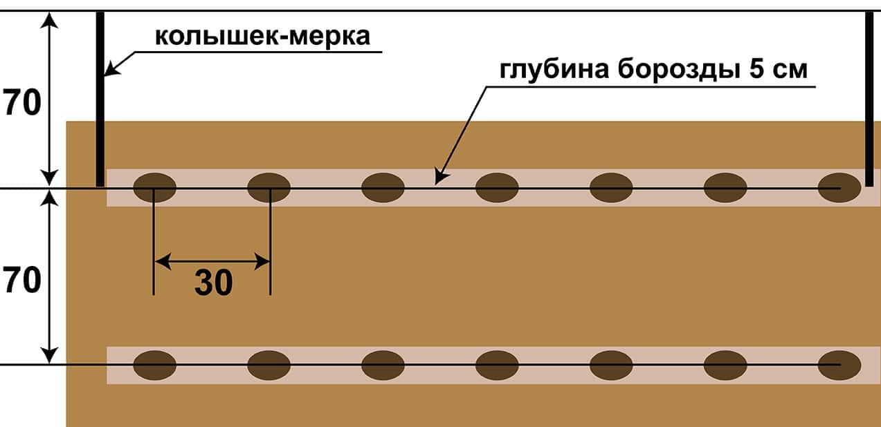- Раскладывают картофель в ряды с промежутком от 30 до 40 см на глубину 5-10 см.