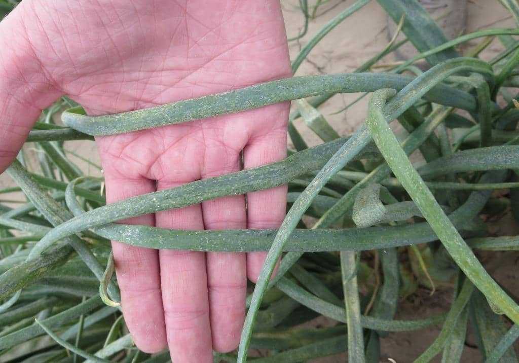 Ложная мучнистая роса. Грибковая болезнь, которая зимует как на луковицах в хранилище, так и в почве. Пораженные стебли приобретают грязно-зеленый цвет, обвисают и отмирают. Как результат – луковица не успевает созреть, и уменьшается количество урожая.