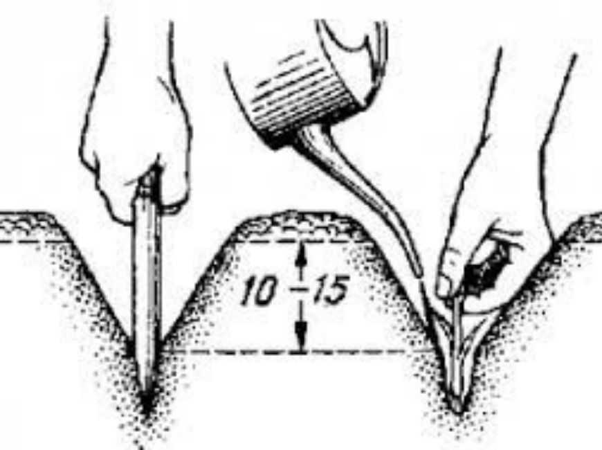 До посева землю нужно предварительно увлажнить. Идеально если семена проращены и их высаживают через 5 см одно от другого. В глубину борозды нужно делать от 1 до 1,5 см.