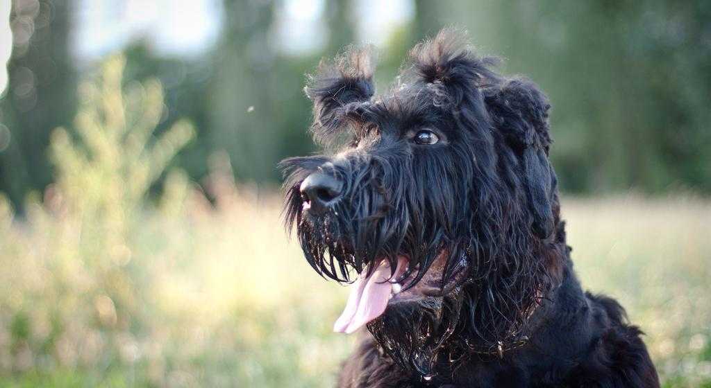 В идеале черный терьер должен иметь густую двойную шерсть: жесткая ость длиной от 5 до 15 см + плотный подшерсток. Морда собаки должна быть обильно украшена волнистым волосом, образующим пышные усы, аккуратную бородку и косматые брови.