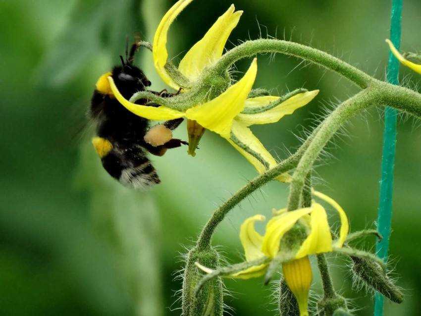 Выращиваемые в теплице помидоры необходимо самостоятельно опылять. Можно воспользоваться механическим способом (переносить пыльцу вручную) или высадить рядом с теплицей растения-медоносы, привлекающие пчел.