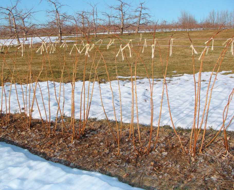 В районах с малоснежными зимами можно оставлять основную обрезку на весну. Большее количество побегов способствует удержанию снега зимой. То же касается некоторых ранних сортов, которые после обрезки начинают пускаться в рост. Побеги таких сортов не укорачивают, а направляют верхушками вниз.