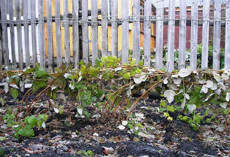 Подвязывая малину на шпалеру, усиливают освещенность куста. Во время укрывания под зиму удобно подвязать к шпалере уложенные кусты.