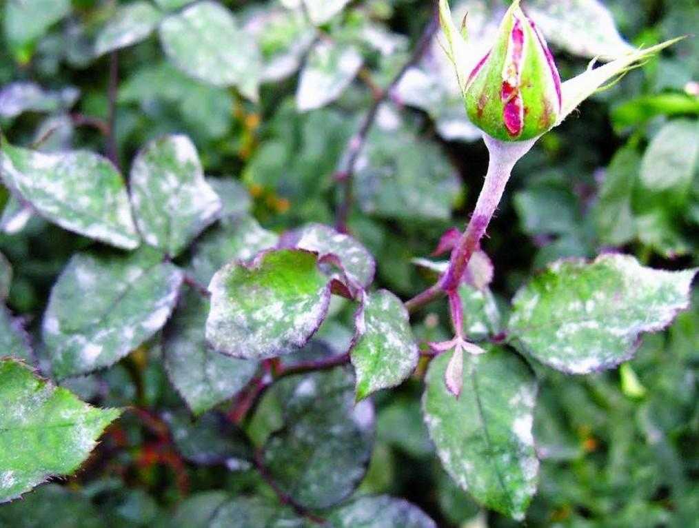 Розы часто подвергаются заражению мучнистой росой при загущении ветвей. Первыми страдают молодые побеги и черешки. Они покрываются белым налетом. Когда споры созревают, выделяются капли жидкости, возникают язвы. Листья желтеют, бутоны мельчают и перестают распускаться.