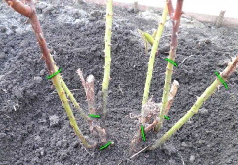 Фото: схема обрезки куста розы (зеленым цветом показаны места где нужно делать срез — убираются сухие или отмершие части)