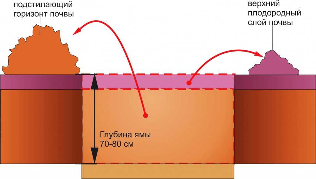 3. Выкапывается лежащий под плодородным слоем подстилающий горизонт почвы, отличающийся от верхнего содержанием гумуса (цветом) и механическим составом. В одних случаях он более легкий (песчаный), а чаще всего тяжелый – суглинистый. Грунта из подстилающего горизонта будет гораздо больше, и его складывают с другой стороны ямы.