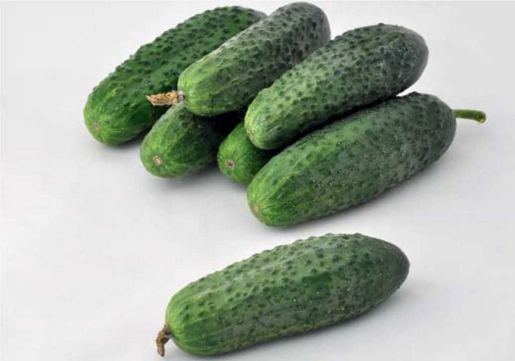 Описание и характеристика плодов: длина зеленца достигает 8-10 см, в поперечнике он около 2,2 см. Средняя масса 50-90 г. На кожице присутствуют выраженные бугорки и белые шипы. Мякоть вкусная и сочная, с прекрасным ароматом, хрустящая. Ее качества становятся еще лучше в консервированном виде, но гибрид подойдет и для свежего потребления.