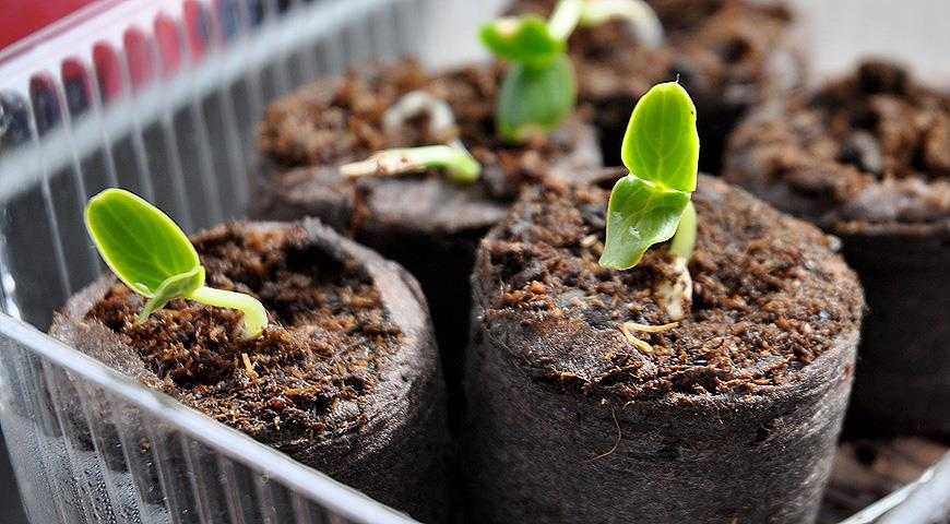 Рассаду сеют в начале апреля (для пересадки в теплицу) или в конце – для открытого грунта. Понадобятся торфяные горшочки по 10-12 см в диаметре и рыхлый питательный субстрат. В каждую емкость высаживают по 1-2 семечка, затем увлажняют, накрывают пленкой и ставят в солнечное место. После всходов температуру в помещении фиксируют на уровне +18-20 градусов.