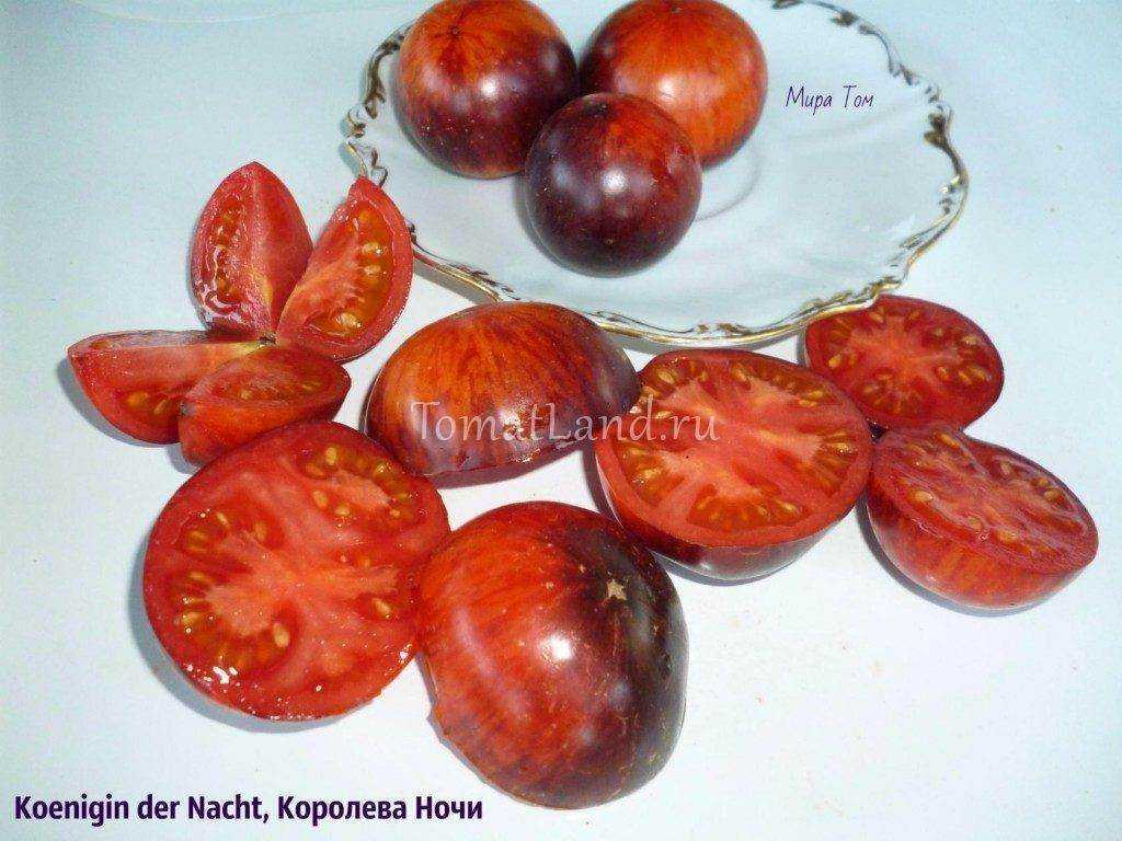 Оригинальное название этого сорта — Koenigin der Nacht. Среднеспелый, среднерослый, экзотический сорт томата для теплиц и открытого грунта. Куст мощный, высотой до 1 метра в открытом грунте, в теплице — чуть выше. Требует подвязки к опоре и пасынкования. Лучшие результаты получились при формирован…