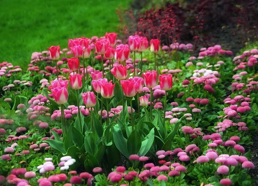 Тюльпаны в центре клумбы, вокруг них высажены маргариткиИсточник lachat.ru