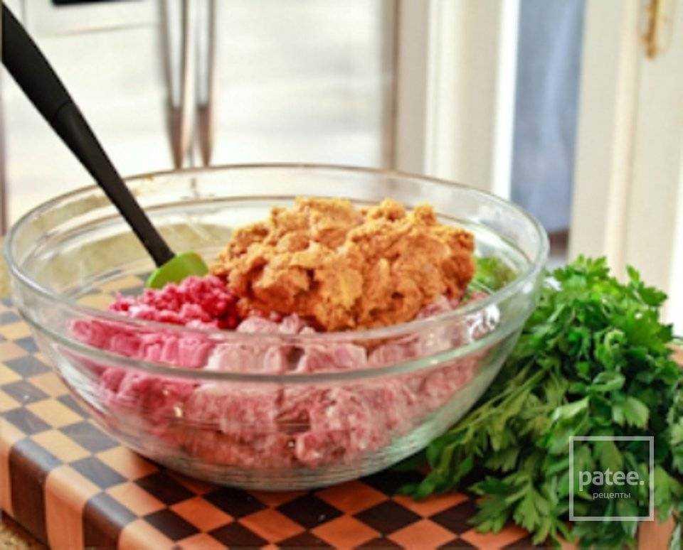- Лук нашинковать, смешать с толченым чесноком. Бекон нарезать небольшими ломтиками.