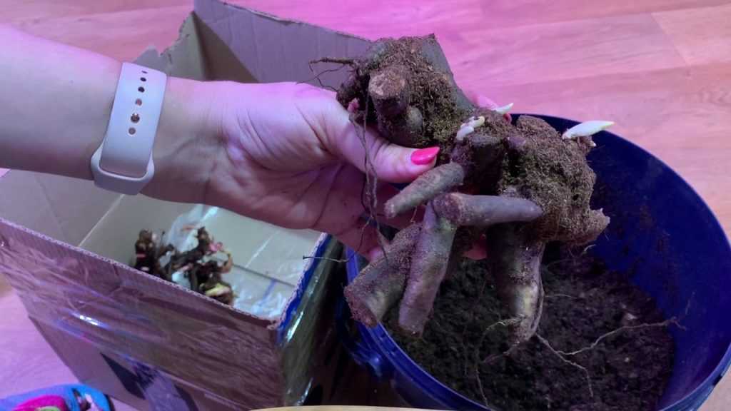 Когда набухнут почки и появятся корешки, можно посадить в емкость с землей. Следует хранить посадку в прохладном месте. После переноса растение хорошо приживется в открытом грунте. Можно хранить и в полиэтиленовом пакете с отверстиями. Корневища обложить мхом, постоянно вести контроль, чтобы они не пересохли.