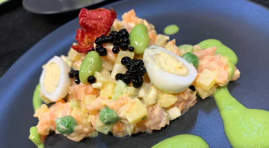 Салат оливье с молекулярной икрой из бальзамического уксуса (фото П. Заварзина)