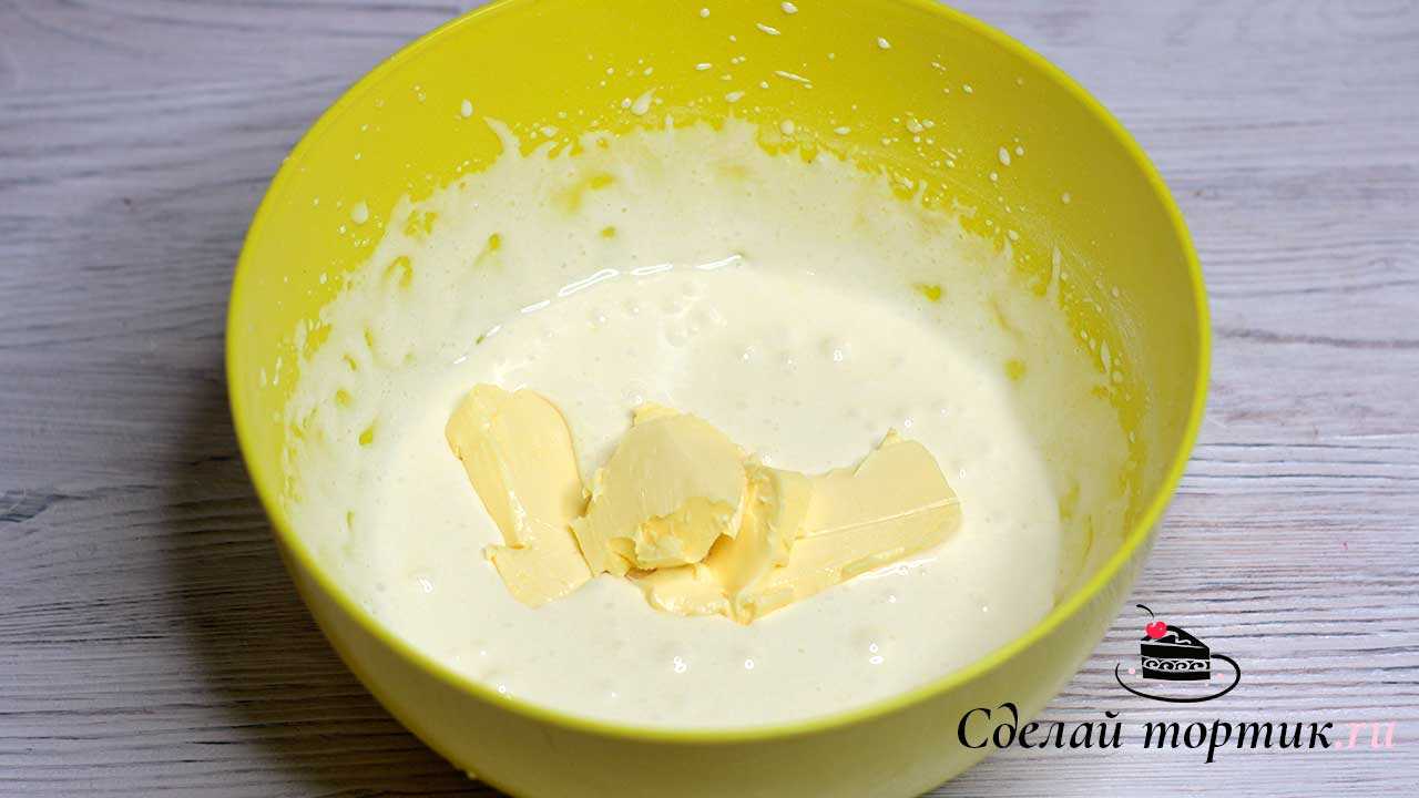 2. Затем добавляем мягкое сливочное масло, снова взбиваем до однородности.
