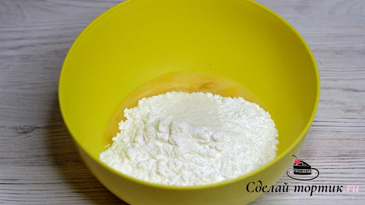 1. В чаше смешиваем желтки, сахарную пудру и ванильный сахар, взбиваем миксером 1 — 2 минуты.