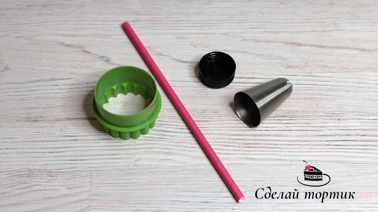 6. Для формирования пуговиц нам понадобится формочка для печенья круглая, насадка для крема, коктейльная трубочка . Если нет формочки и насадки замените на стакан, рюмочку и пробку от пластиковой бутылки.