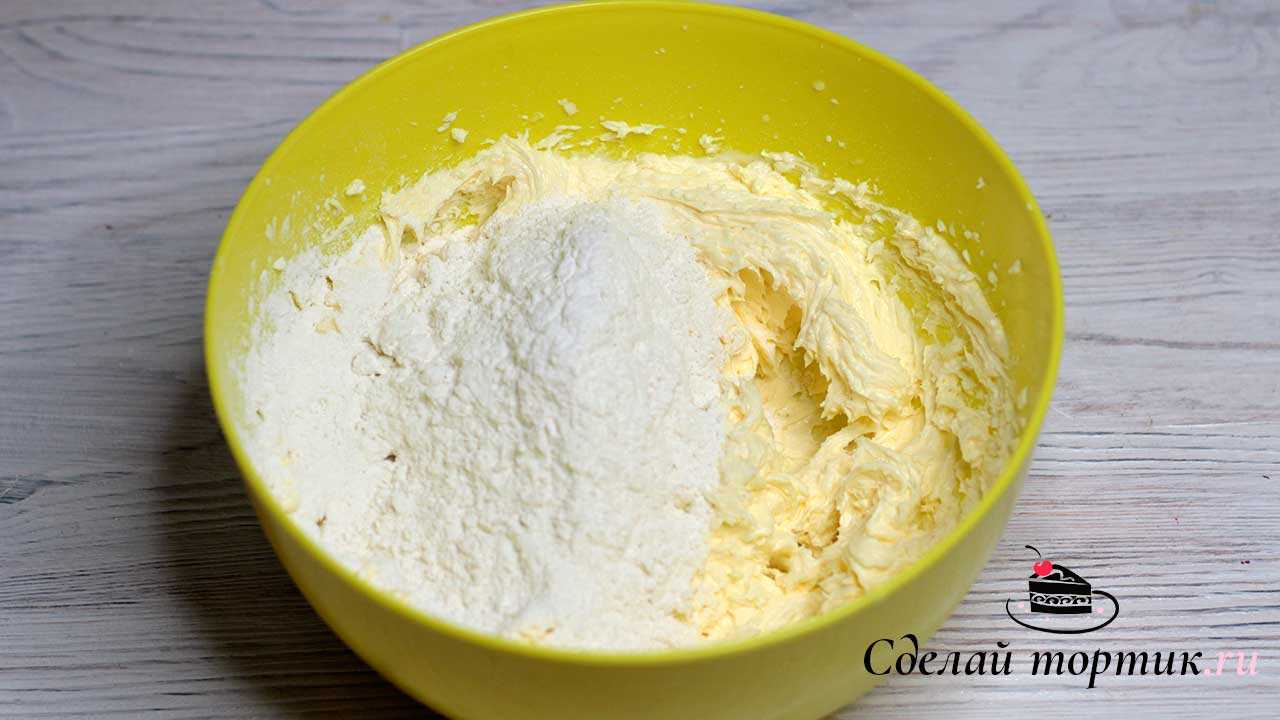 3. Муку просеиваем, соединяем с разрыхлителем, добавляем частями к сливочной массе и замешиваем тесто.