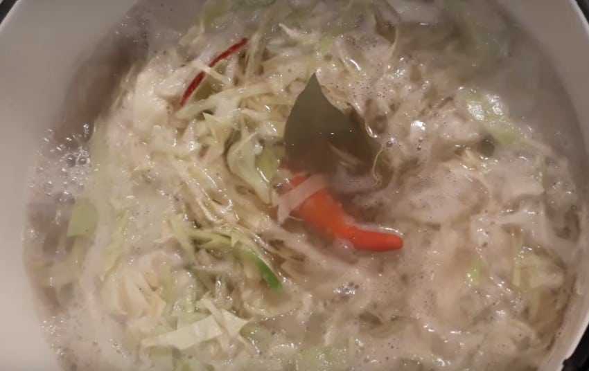 5. Капусту тонко нашинкуйте и добавьте в кастрюлю, после чего варите 1 минуту. Приправьте по вкусу и держите на медленном огне ещё 3 минуты.