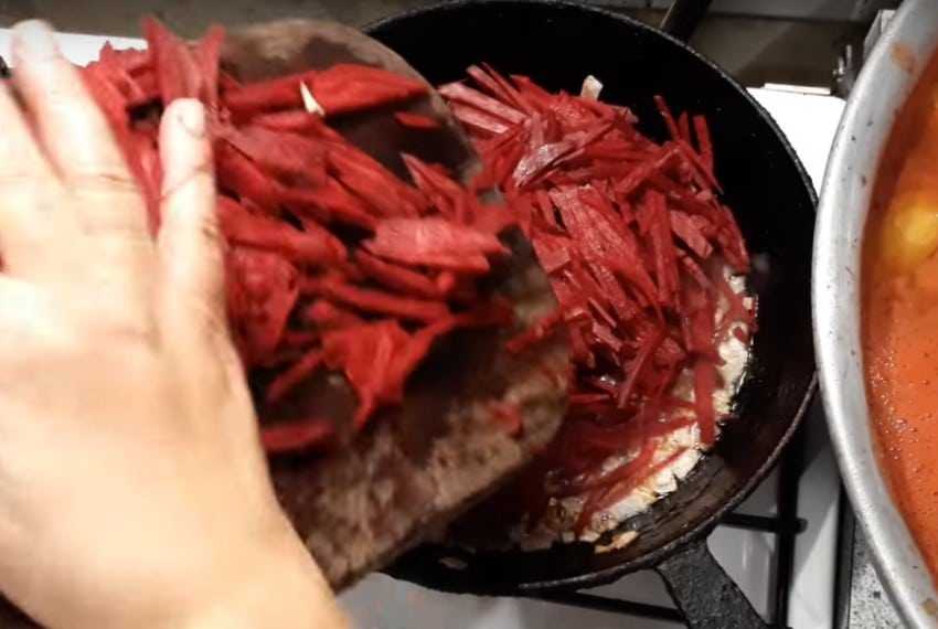 4. Свеклу измельчите в тонкую соломку и обжарьте на небольшом количестве масла пару минут, предварительно добавив половину чайной ложки уксуса. После этого переложите массу в суп.