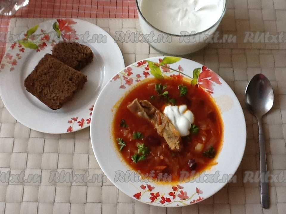 - От аромата разыгрался аппетит! Можно пробовать наш борщ на свиных ребрышках с фасолью! Подаем его со сметаной и свежеиспеченным домашним хлебушком!