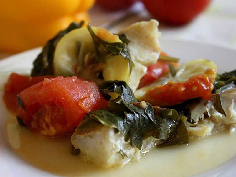 Уточнение: кстати! А кто и что мешает приготовить это блюдо на природе в казане? Никакой отдельной формы не нужно — обжарили на жарком огне лук и чеснок, разложили рыбку и овощи, залили кипяточком, угли отгребли — остаточного жара как раз хватит. Ну и подождать полчаса.