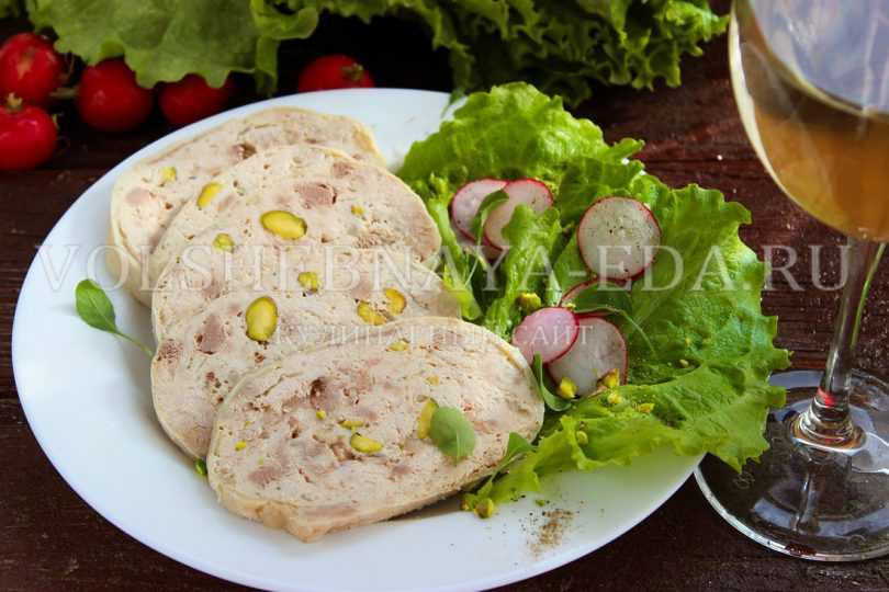 - Во время выпечки периодически нужно будет сливать жидкость, которая будет появляться на поверхности галантина. Извлекать его из формы можно только после полного остывания.