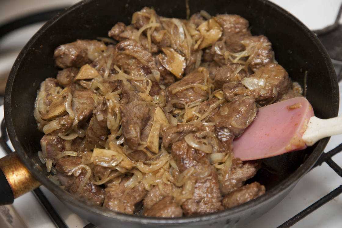 - Отправить к обжаренному луку мясо, жарить его, постоянно помешивая. Как только мясные кусочки поменяют свой цвет, их необходимо будет посыпать мукой.