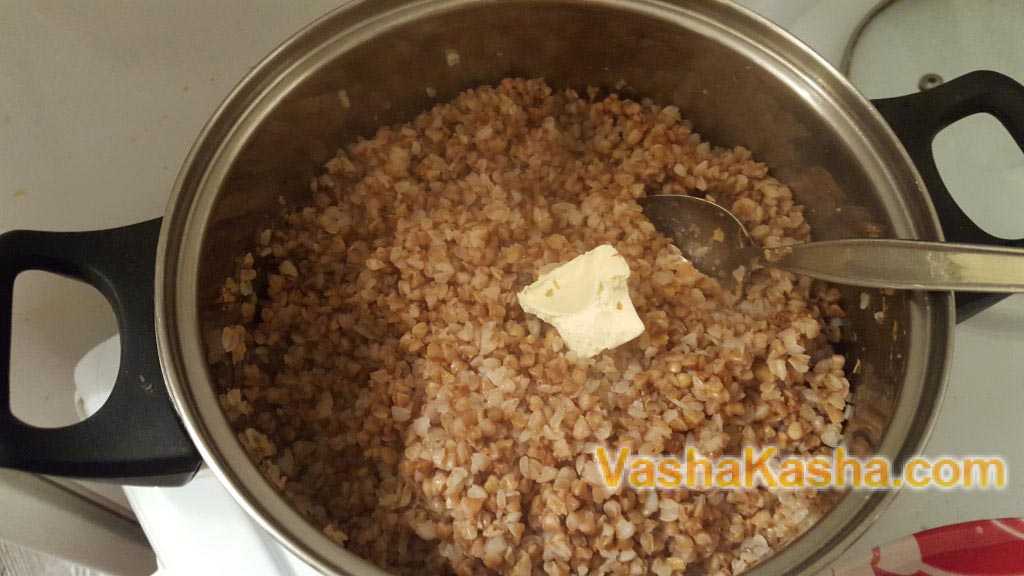Пока лук жарится, надо отмерить необходимое количество гречневой крупы и поставить греться чайник с аналогичным количеством воды. На дно стоящей на огне кастрюли бросить кусок сливочного масла, когда оно растопится и начнет шкворчать, высыпать туда крупу и хорошо перемешать, равномерно распределяя масло. Таким образом обжаривать гречку на небольшом огне нужно в течение нескольких минут, пока закипает вода.