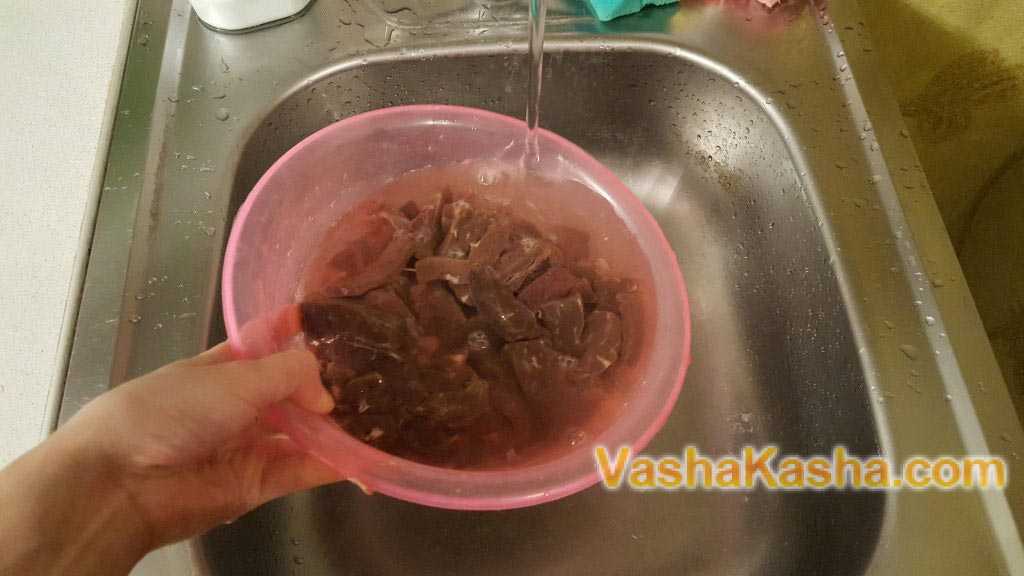 Для начала займёмся сердечками. Их нужно почистить от сосудов и сгустков крови, разрезая каждое пополам, после промыть водой. Кстати, в это время лучше начать варить яйца.