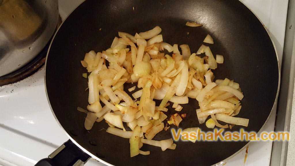 Когда лук будет полностью готов – станет мягким и хорошо подрумянится – его нужно сдвинуть на край сковороды.