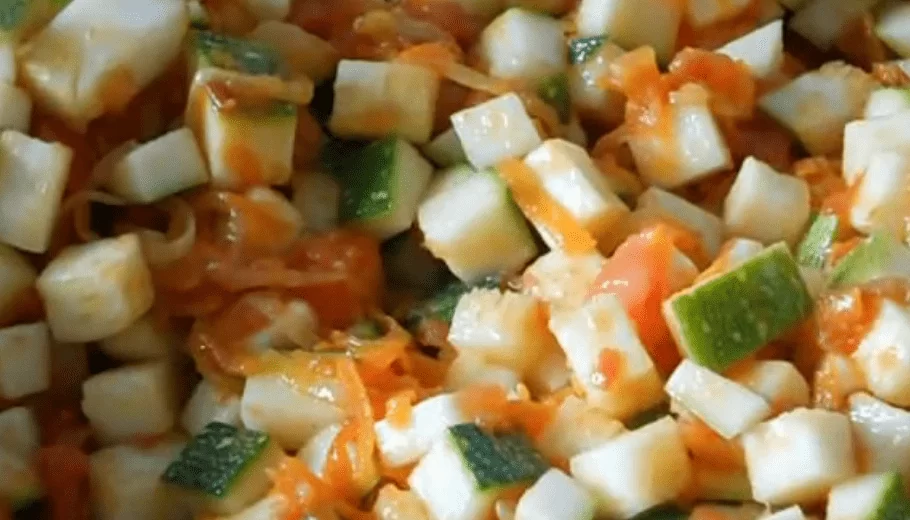 - С кабачков срезаем кожицу, нарезаем кубиками среднего размера. Отправляем к пассированным овощам, перемешиваем.