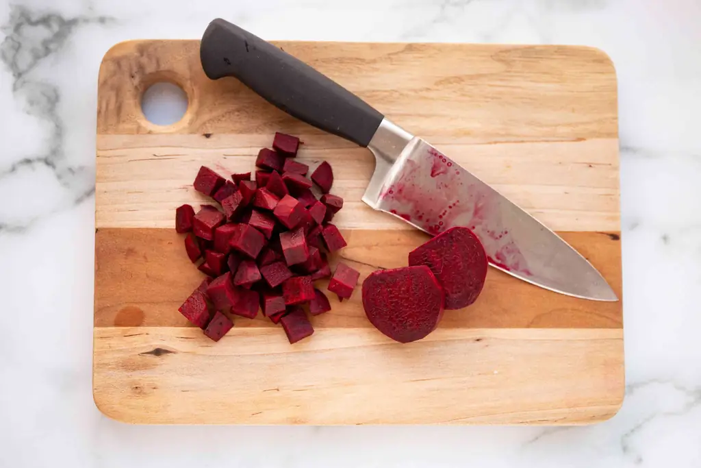 Почистите свеклу, затем отрежьте верхушки и корни. При желании их можно очистить. Нарежьте свеклу кубиками или кусочками толщиной 1/2 дюйма или нарежьте ее ломтиками толщиной 1/4 дюйма.